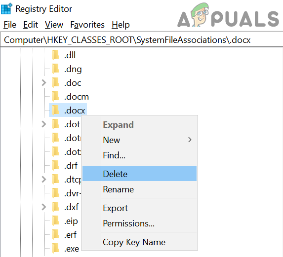 - Now, in the left pane, right-click on the .docx key and choose Delete. Then confirm to delete the .docx key