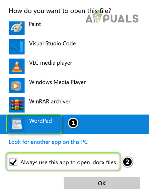- If the issue persists, revert the default Docx app to Wordpad (by following steps 1 to 3) and right-click on a Word File.