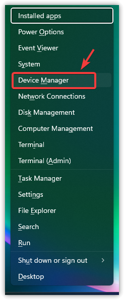 - Right-click the Start icon and select Device Manager.