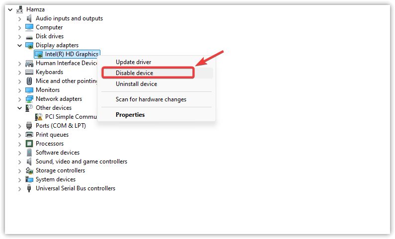 - Right-click the integrated graphics adapter (e.g., Intel HD Graphics).