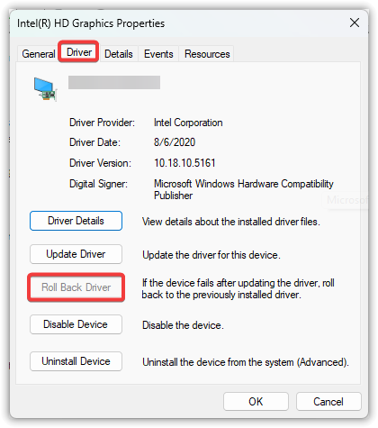 - Click on Roll Back Driver (if available).