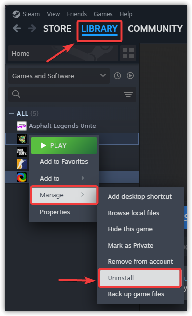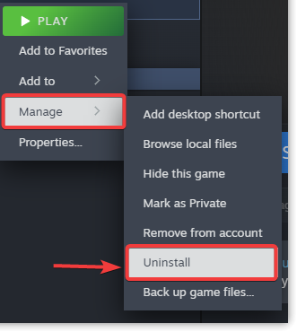 - Right-click on DOOM: The Dark Ages and select Manage > Uninstall.