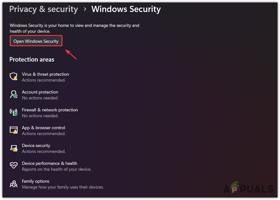 - Then click Open Windows Security.