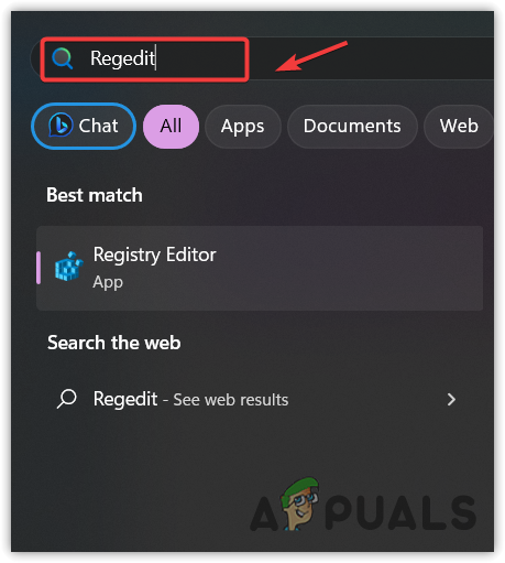 - Click the Start Menu button, type Regedit, and hit Enter to open the registry editor.