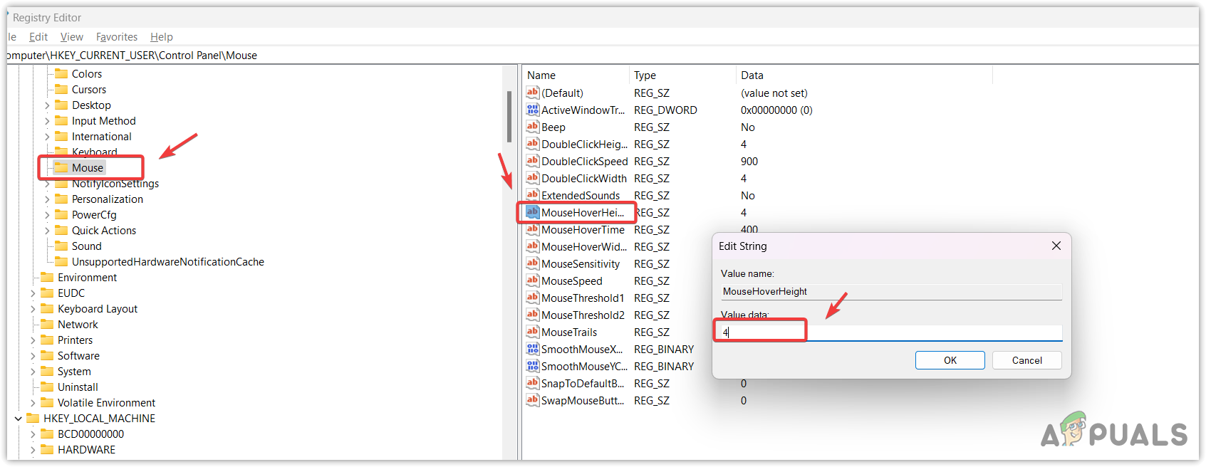 - Then, double-click the MouseHoverHeight to change its value data to 4.
