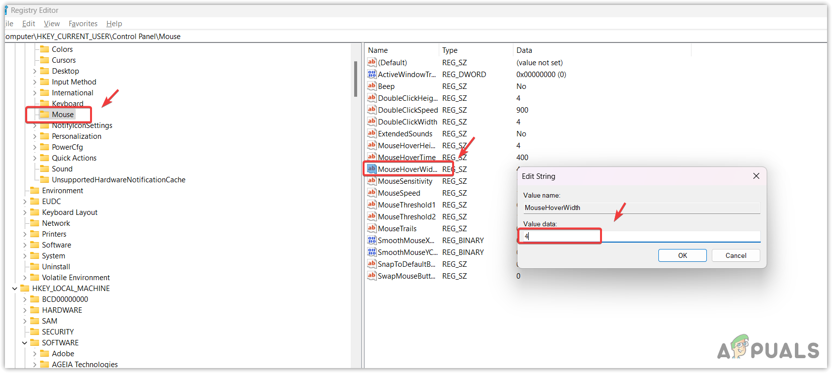 - In the right pane, double-click the MouseHoverWidth, change its value data to 4, and click OK.