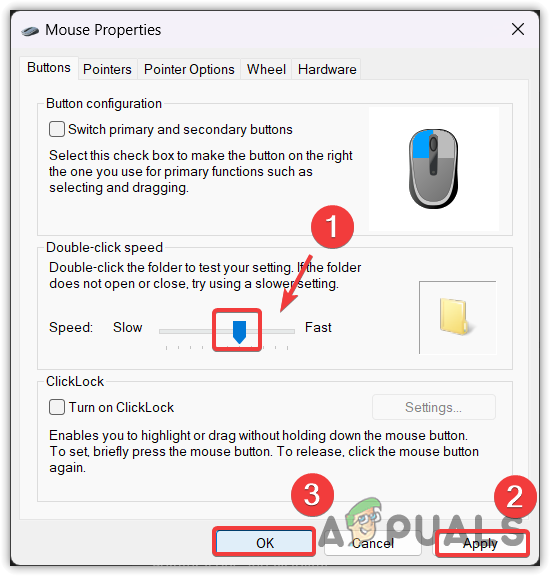 - Here slow down the double-click speed and click Apply and click OK.