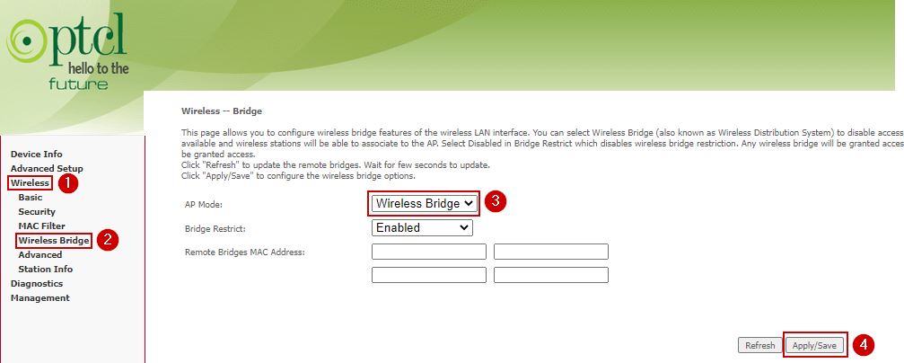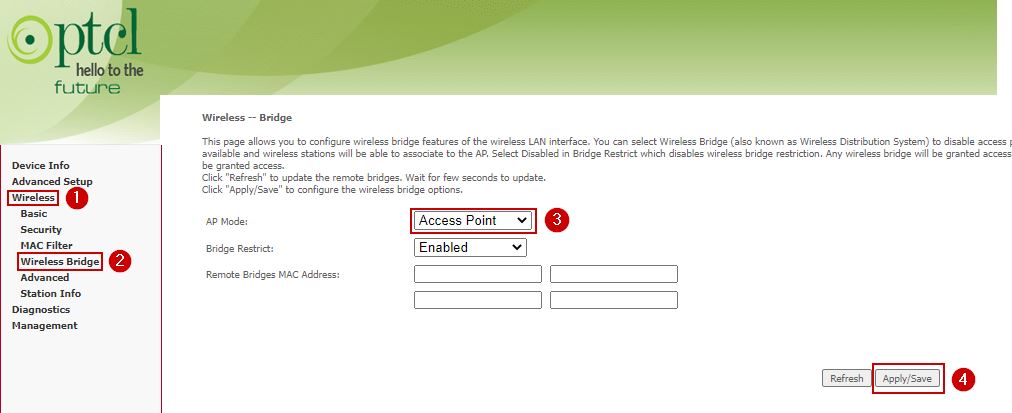- There will be the option to operate the gateway as a Bridge, Wireless Bridge, or WDS Bridge mode. Select one and save the changes.