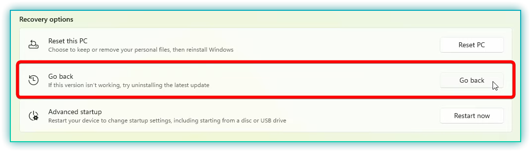 - Under the Recovery options, look for the Go back section and click on the Go back button.