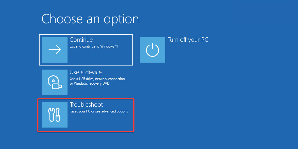 - Once in WinRE (Windows Recovery Environment), select Troubleshoot from the available options.