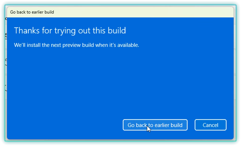 - You may be prompted with some tips about what to keep or lose. Click through these options, and finally, click on Go back to an earlier build to start the process.