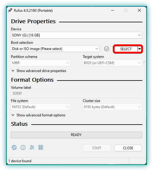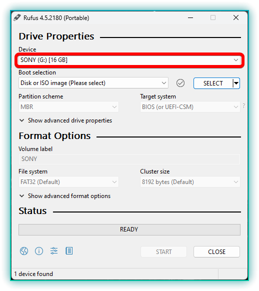 - Open the Rufus application. It should automatically detect your USB drive.