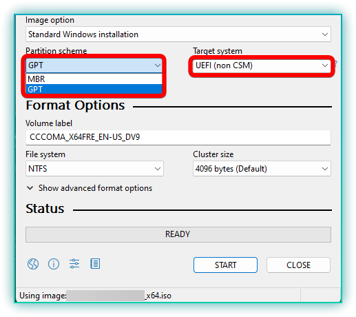 - For the Partition scheme, choose either MBR (Master Boot Record) or GPT (GUID Partition Table) based on your system’s firmware (BIOS or UEFI). If unsure, MBR is often more compatible.