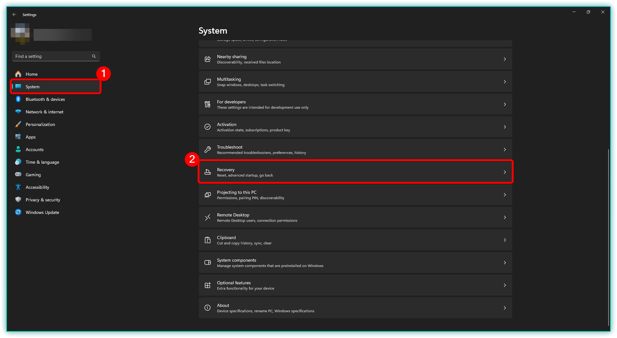 - In the Settings window, click on System in the left sidebar. Scroll down and select Recovery.