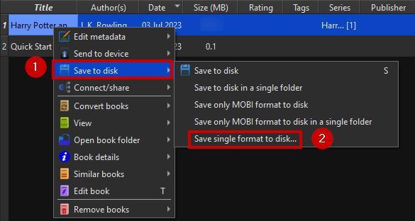 - After it completes, right-click on the book and click on Save to disk > Save single format to disk.