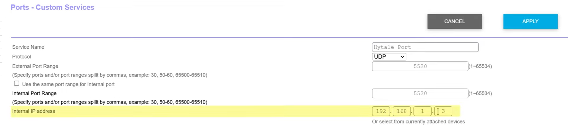 - Enter the Service Name as Hytale Port > Set the protocol as UDP > Enter the External and Internal Port Range as 5520 and enter your Internal IP address (IPv4 Address) that you’ve noted down.