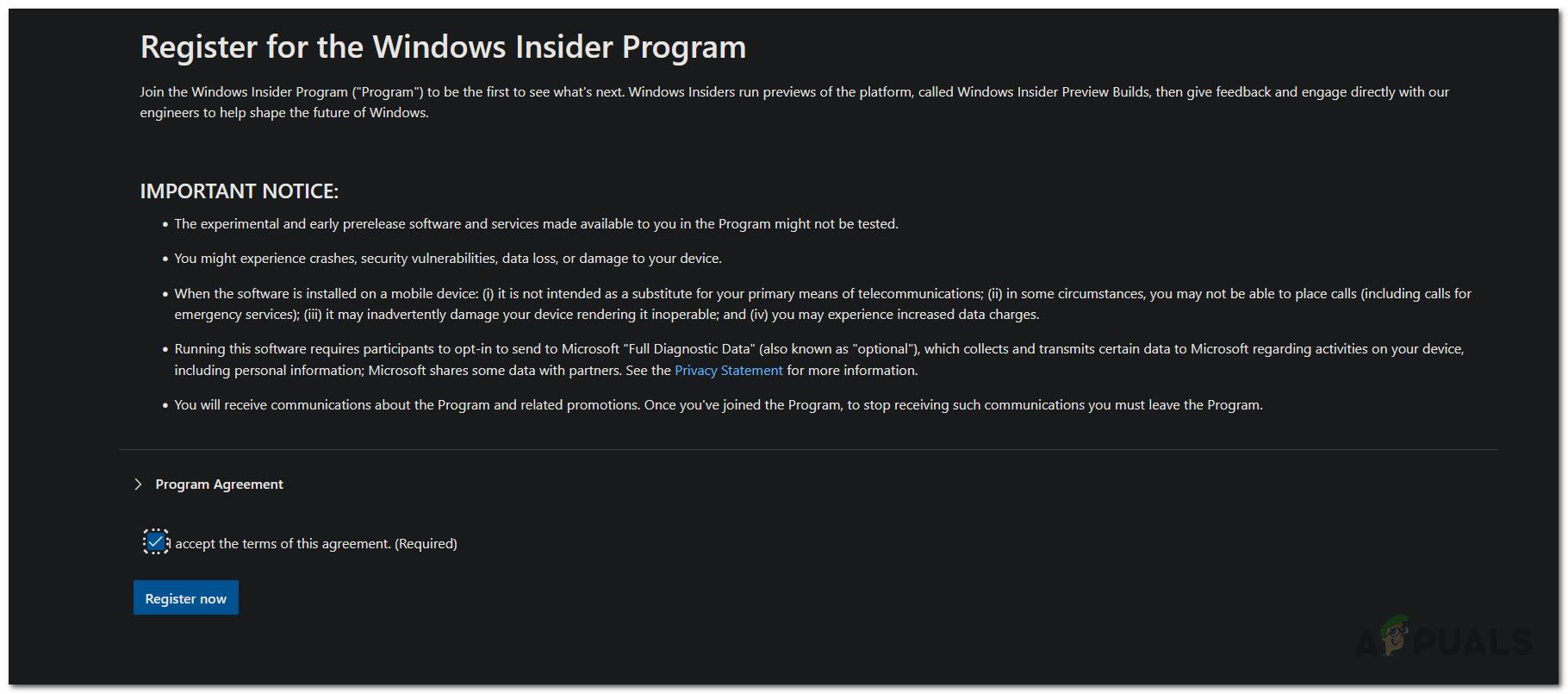 Registering for Windows Insider Program - Accept the terms of the agreement by clicking the checkbox provided. After that, click the Register now button to register for the Windows Insiders Program.