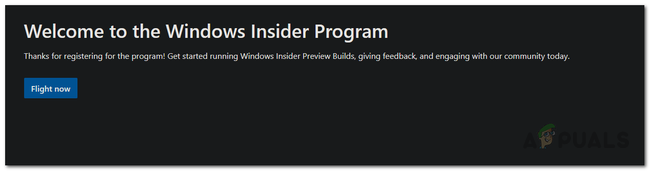 Accepting Windows Insider Program Terms of Agreement - On the next prompt, you will be shown the Welcome to the Windows Insider Program message. Click the Flight now button provided.