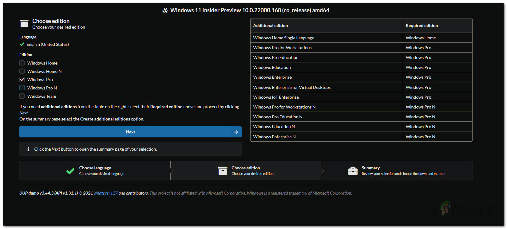 Choosing Windows 11 Language - Now, you will be asked to choose the Windows 11 edition you wish to download. Choose whatever you wish and then click Next.