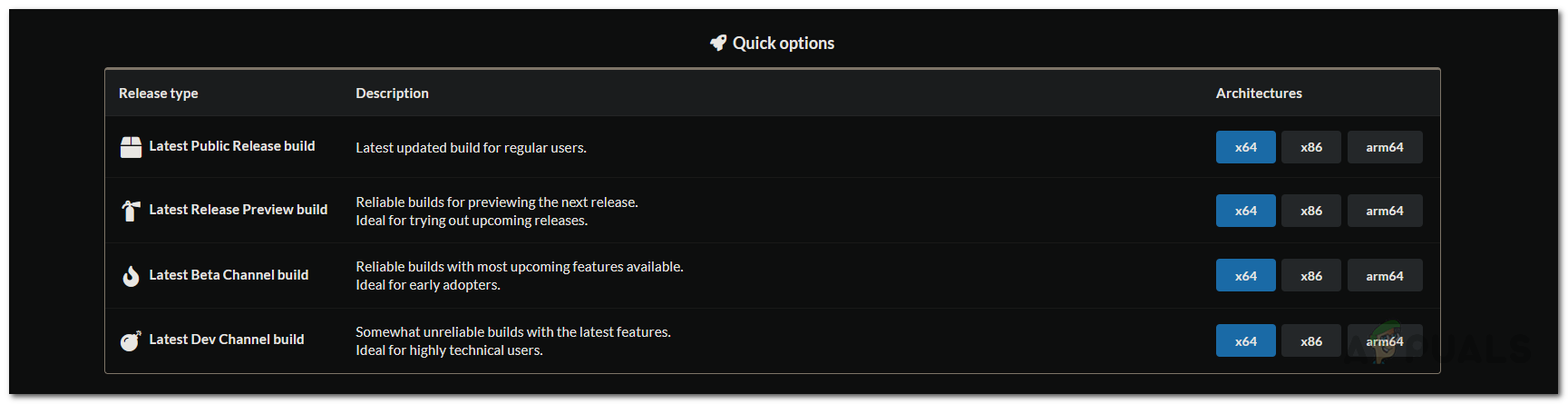 - On the website, under Quick Options, click on your system’s architecture for the Latest Beta Channel Build. You can also do this for the Latest Dev Channel Build but we recommend going for the afore-mentioned option as it is more stable. At the current moment, there’s no Windows 11 update for the Public Release build, however, in future once it is available in Public Release, you can use that option as well.