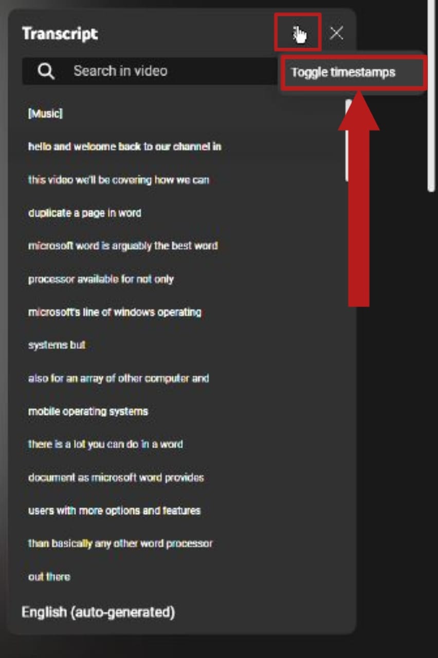 Click on the three-dot button next to the ‘Close‘ button on the transcript. On the drop-down menu, select ‘Toggle timestamps‘ to remove the timestamps from the transcript.
