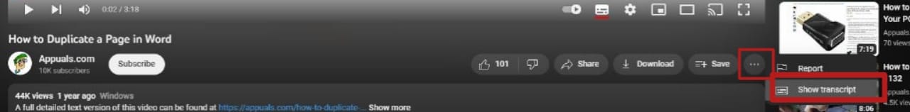 - Click on the three-dot buttton next to the ‘Save‘ option. A drop-down menu should appear. Select ‘Show transcript‘.