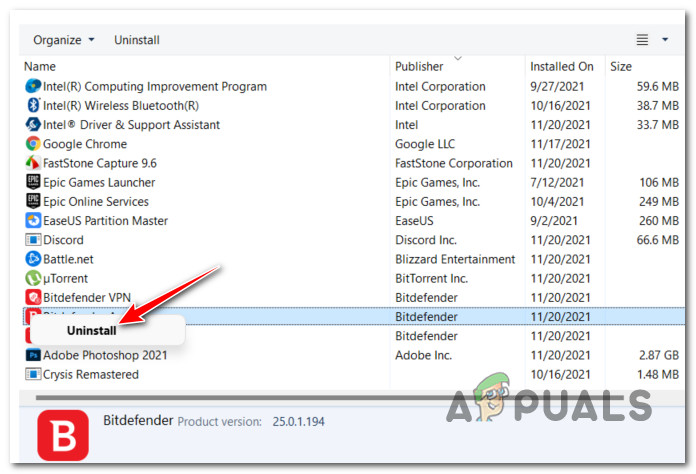 Open up the Programs and Features menu - Once you’re inside the Programs and Features menu, scroll down through the list of installed programs and locate the firewall installation that you suspect is conflicting with Origin.