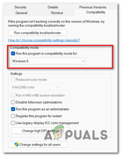 Access the Properties screen - Once you’re inside the properties screen, access the Compatibility tab and start by checking the box associated with Run this program in compatibility mode for (under Compatibility Mode).