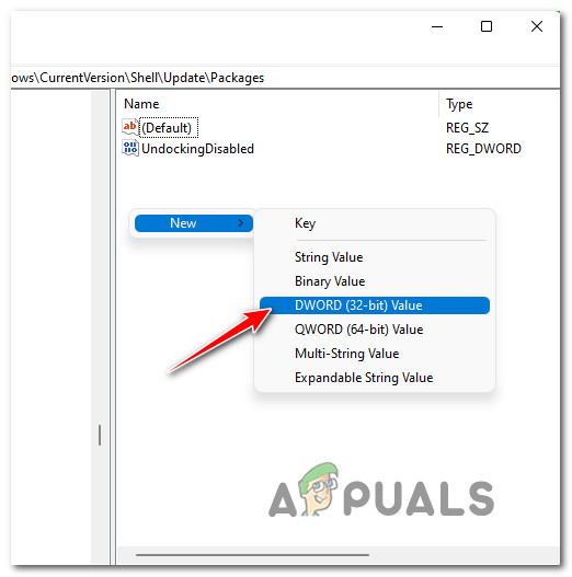 - Once you’re there, right-click on an empty space and choose NEW > Dword (32-bit) Value from the context menu that just appeared.