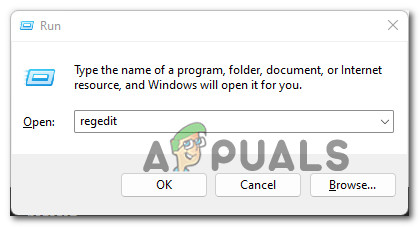 - Press Windows key + R to open up a Run dialog box. Next, type ‘Regedit inside the text box and press Ctrl + Shift + Enter to open up the Registry Editor with admin access.