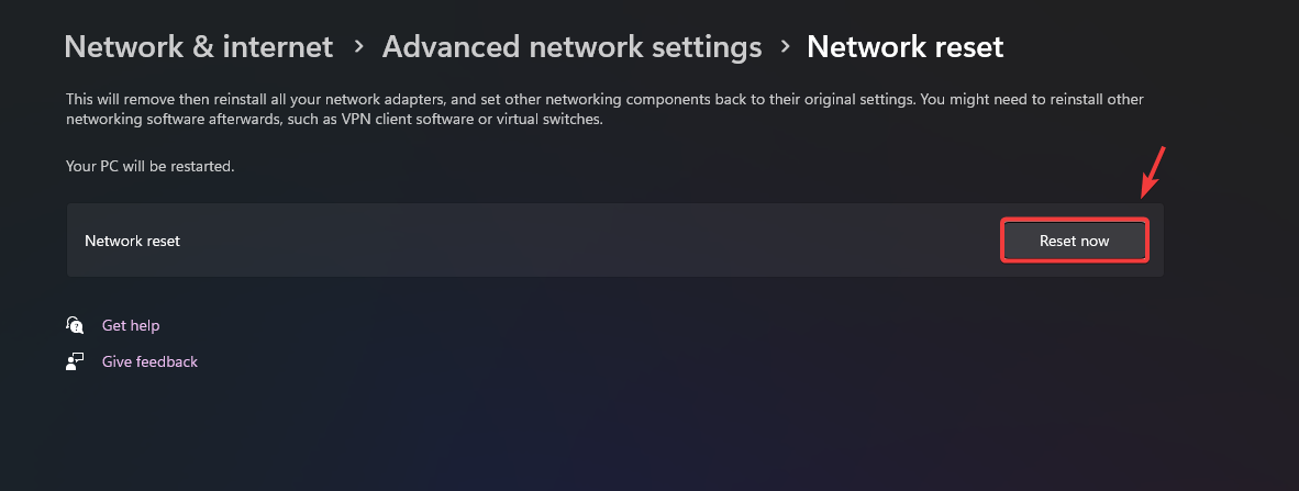 - Click Reset Now to restore the network settings to default.