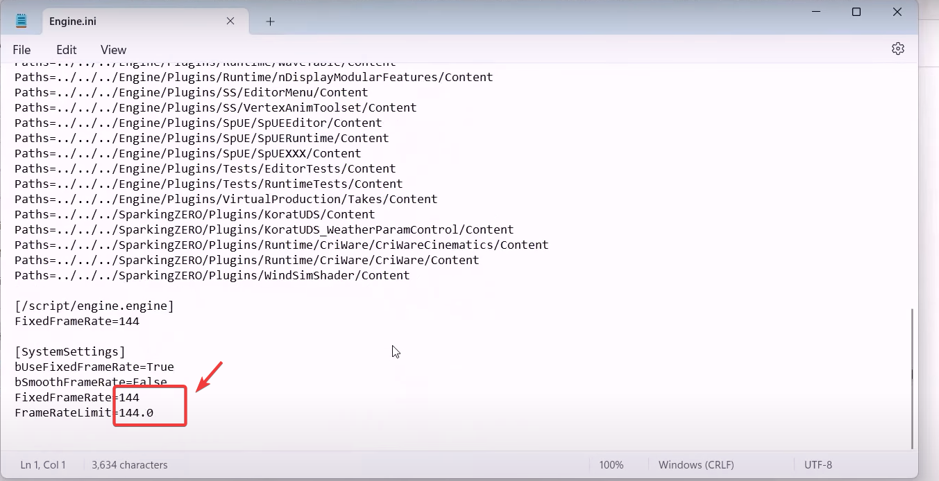 - Scroll down to the bottom and change the value of FixedFrameRate and FrameRateLimit to 60 or your monitor’s hertz.