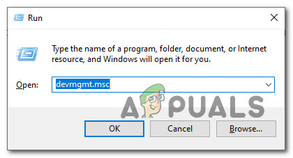 - Press Windows key + R to open up a Run dialog box. Inside the text box, type ‘devmgmt.msc’ and press Enter to open up Device Manager. If you’re prompted by the UAC (User Account Control), click Yes to grant admin access.