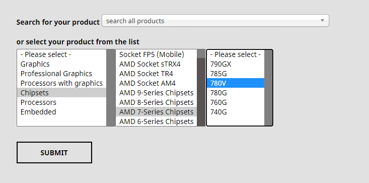 - Once you’re on the correct page, scroll down and use the Search for your product section to choose Chipsets from the column on the left, then choose your processor socket from the right section.