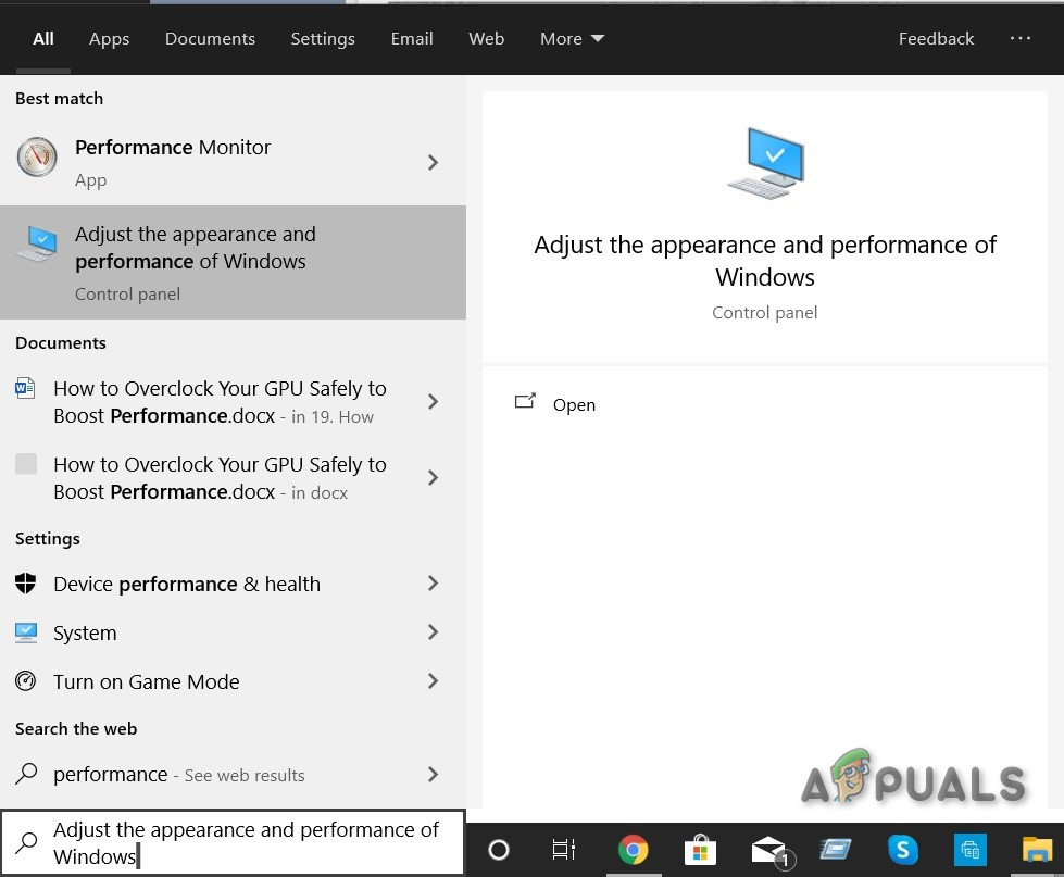 - From the context menu that just opened, select Adjust Appearance and Performance of Windows when the results are displayed.