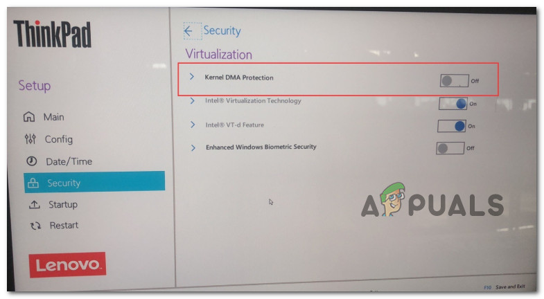 Several affected users have confirmed that once they accessed their BIOS and disabled Kernel DMA Protection from the Security (Virtualization) tab, the DRIVER VERIFIER DMA VIOLATION problem stopped occurring.