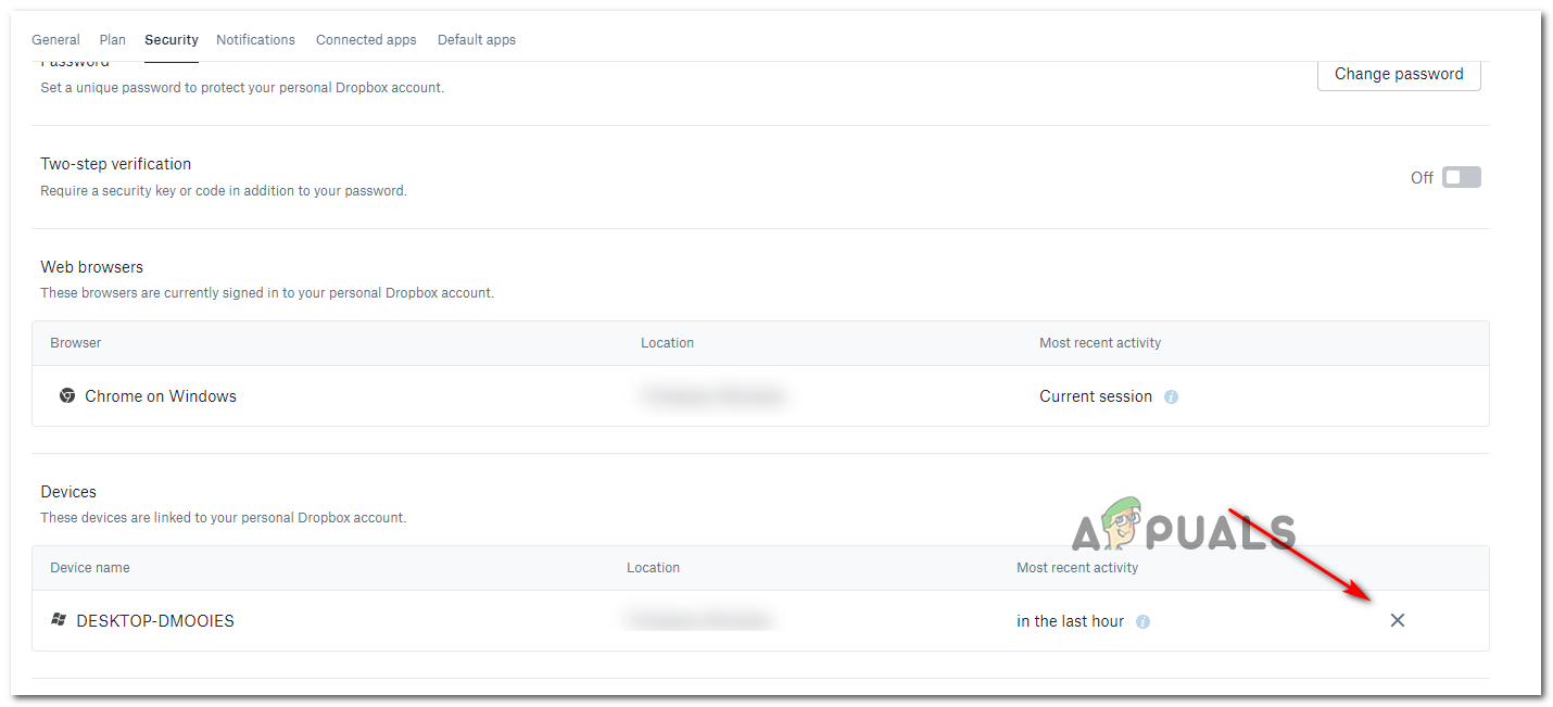 - From the Security tab, scroll all the way down to Devices, and click the X button associated with the Windows computer you’re encountering the ‘Dropbox failed to uninstall’ error on.