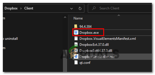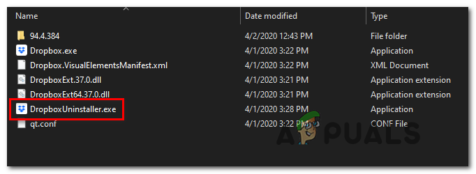 If none of the potential fixes above have worked for you, you should proceed by doing a manual uninstall in order to bypass Programs & Features. This can be done by accessing the installation folder of Dropbox and doing the uninstallation via the DropboxUninstaller.exe file.