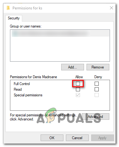Accessing the Permissions screen - Next, from the Security tab, select the local user that you’re currently using (from Group or user names) and then check the Allow box associated with Full Control, then click Apply to save the changes.
