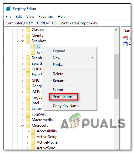 - After you manage to arrive at the correct location, look at the set of sub-keys under Dropbox. Next, start by right-clicking on the first one and choosing Permissions from the newly appeared context menu.
