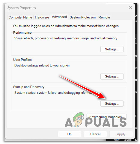 - First, select the Advanced tab, then find the Startup and Recovery section and click the Settings button in the resulting System Properties window.