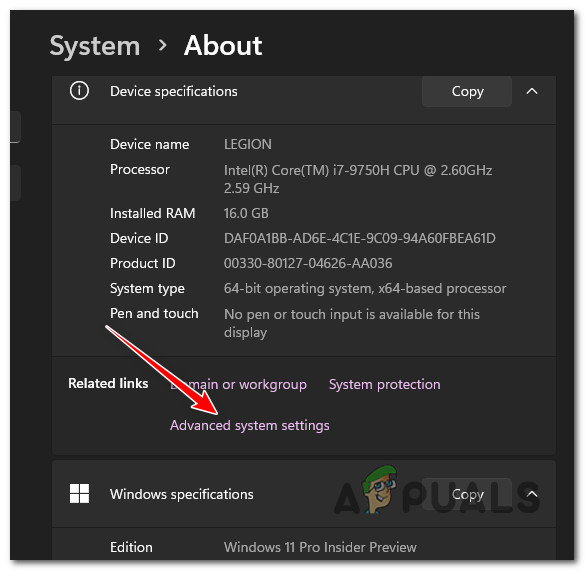 - Click on Advanced system settings in the Related settings section by scrolling down.