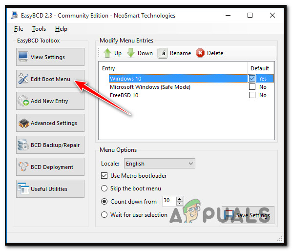 - Open EasyBCD, then choose the Edit Boot Menu option.