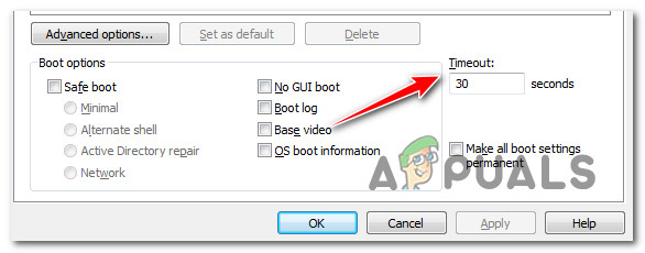 Timeout Column msconfig Note: These settings are expressed in seconds, so if you set it to 30, the boot manager will hold off loading the default OS for 30 seconds.