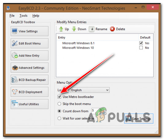 - Check the Use Metro bootloader box under Menu Options.