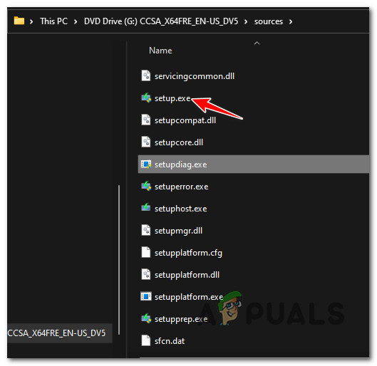 Once you’re inside the root path of the recently mounted ISO, double-click on sources, then look through the available files and double-click on setup.exe.