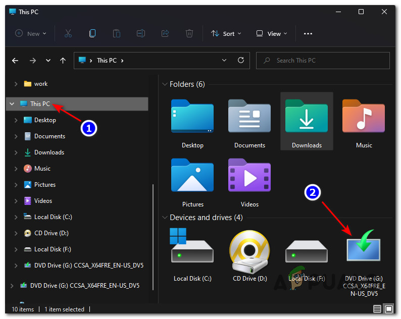 Next, open File Explorer by clicking on its icon or by pressing Windows key + E. Inside File Explorer, ensure that you have the This PC tab selected on the left, then right-click on the ISO that you just mounted from the right-hand pane and click on Open from the context menu that just appeared.