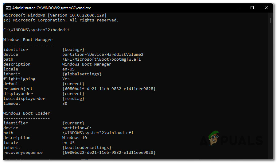 - Inside the elevated Command Prompt, type “bcdedit” and press Enter to get a Windows Boot Manager inquiry.
