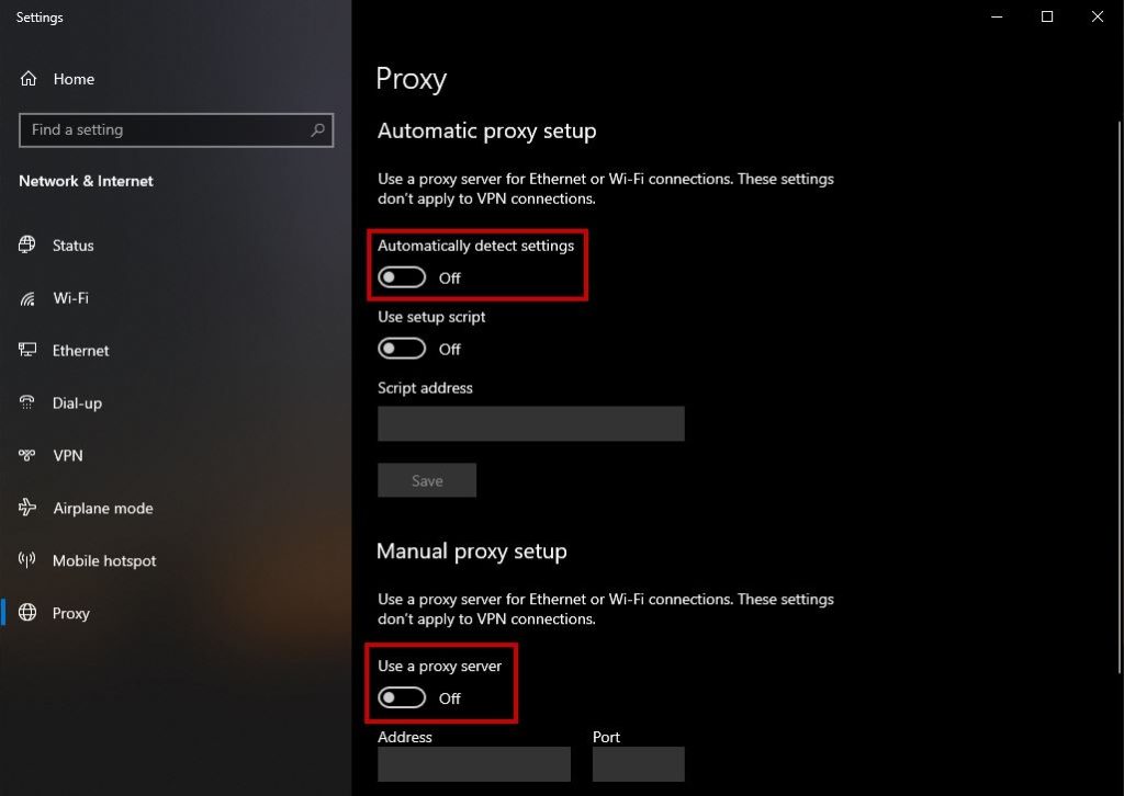 Let’s rule out both of these causes. Follow this to disable the proxy settings: