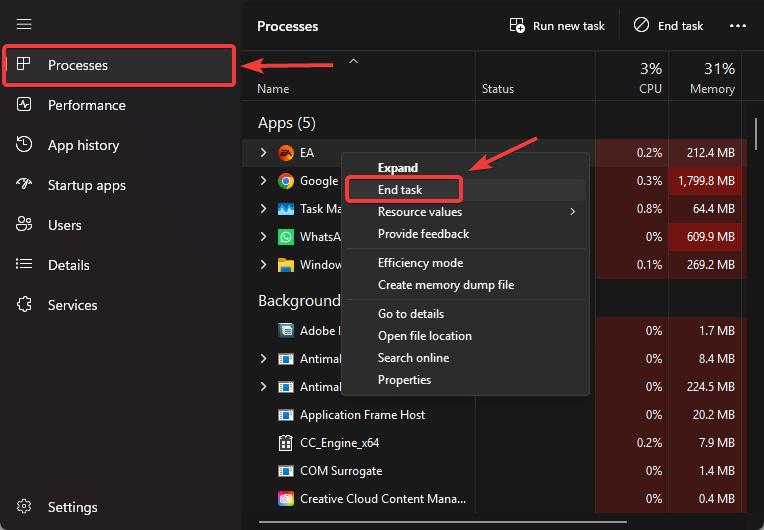 - Under the Processes tab, locate all EA-related tasks (EA App, EA Background Services, or Anticheat processes).